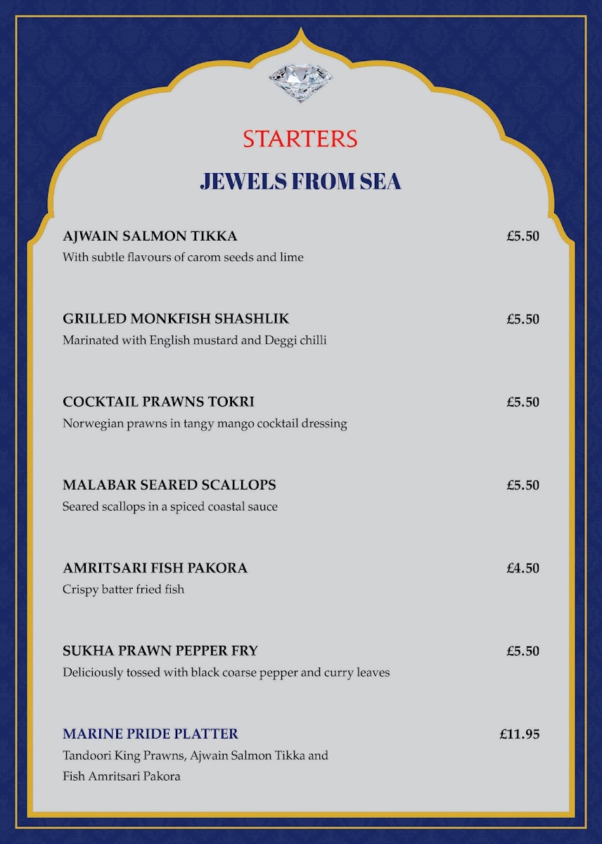 Tandoori king prawns, Ajwain Salmon Tikka and Amritsari Fish Pakora